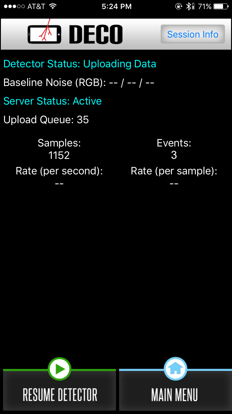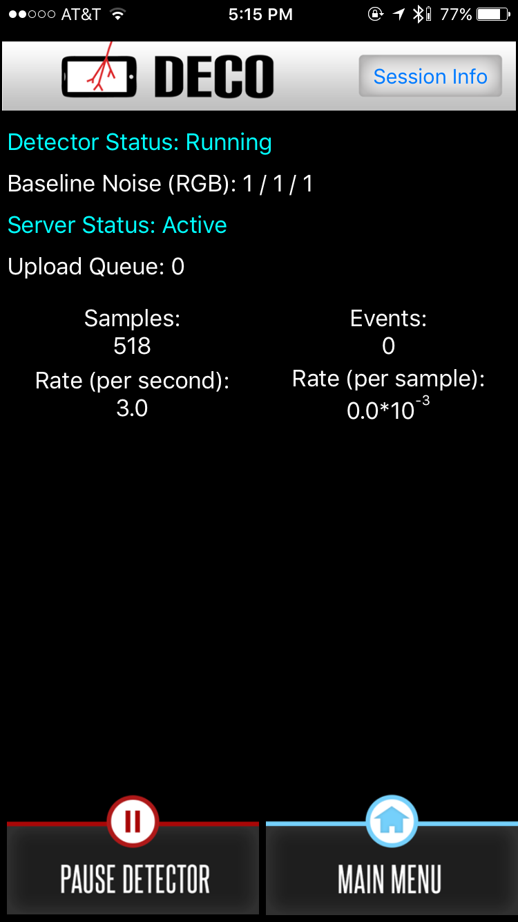 Screenshots showing DECO running with the camera covered on an iPhone 6S with the image capture & processing, networking, and UI code I wrote in Swift.