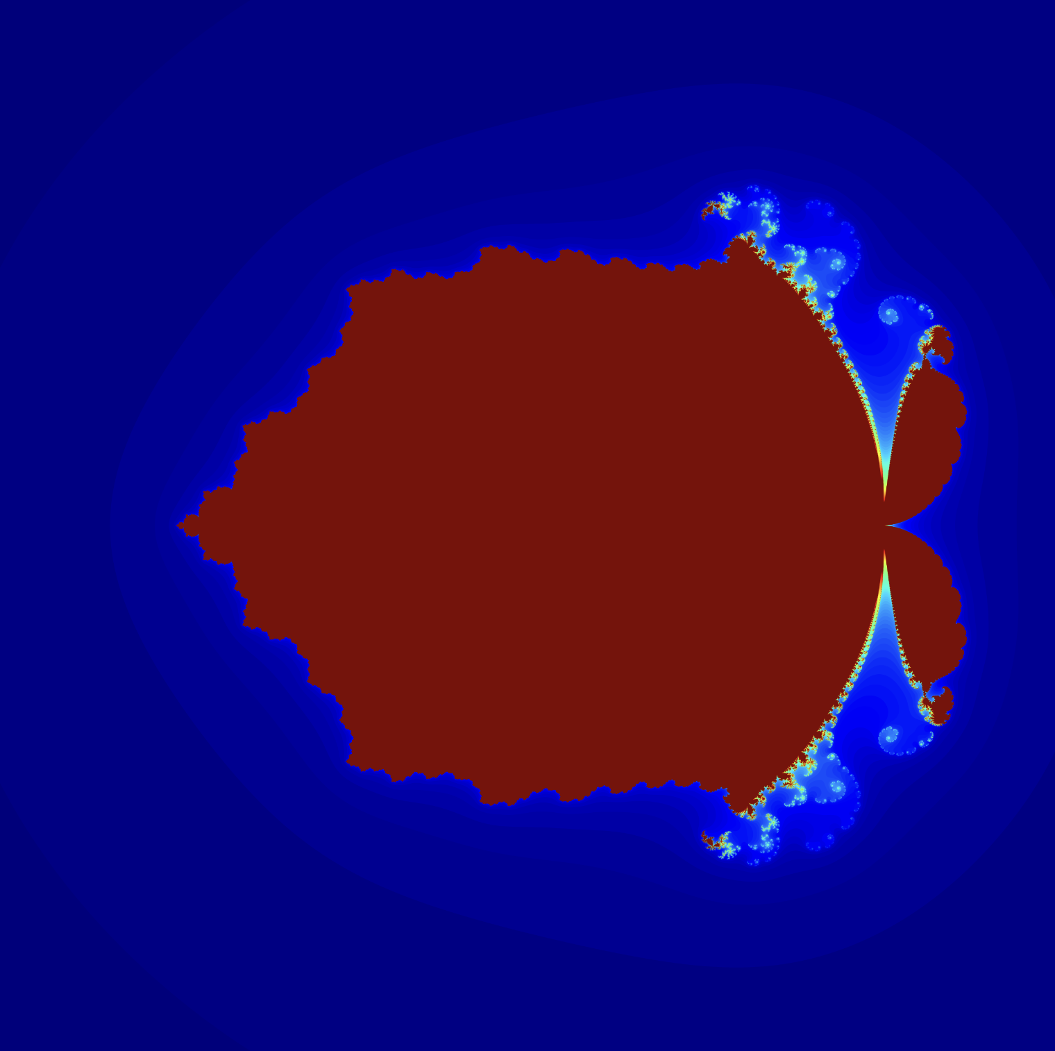 Set of numbers on the complex plane which are stable (red) and unstable (yellow-blue colormap) when iterated under: